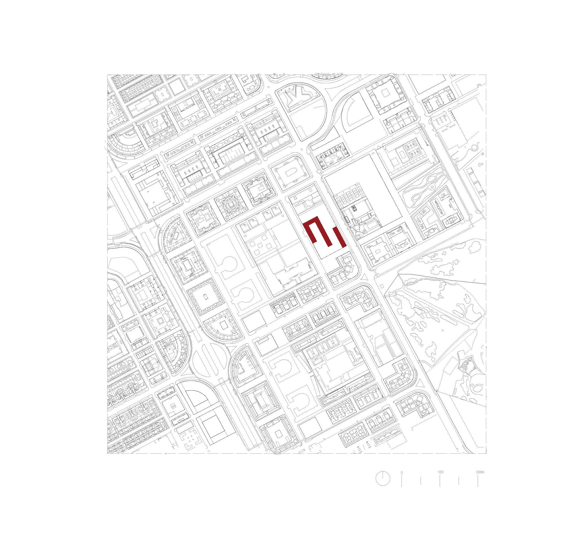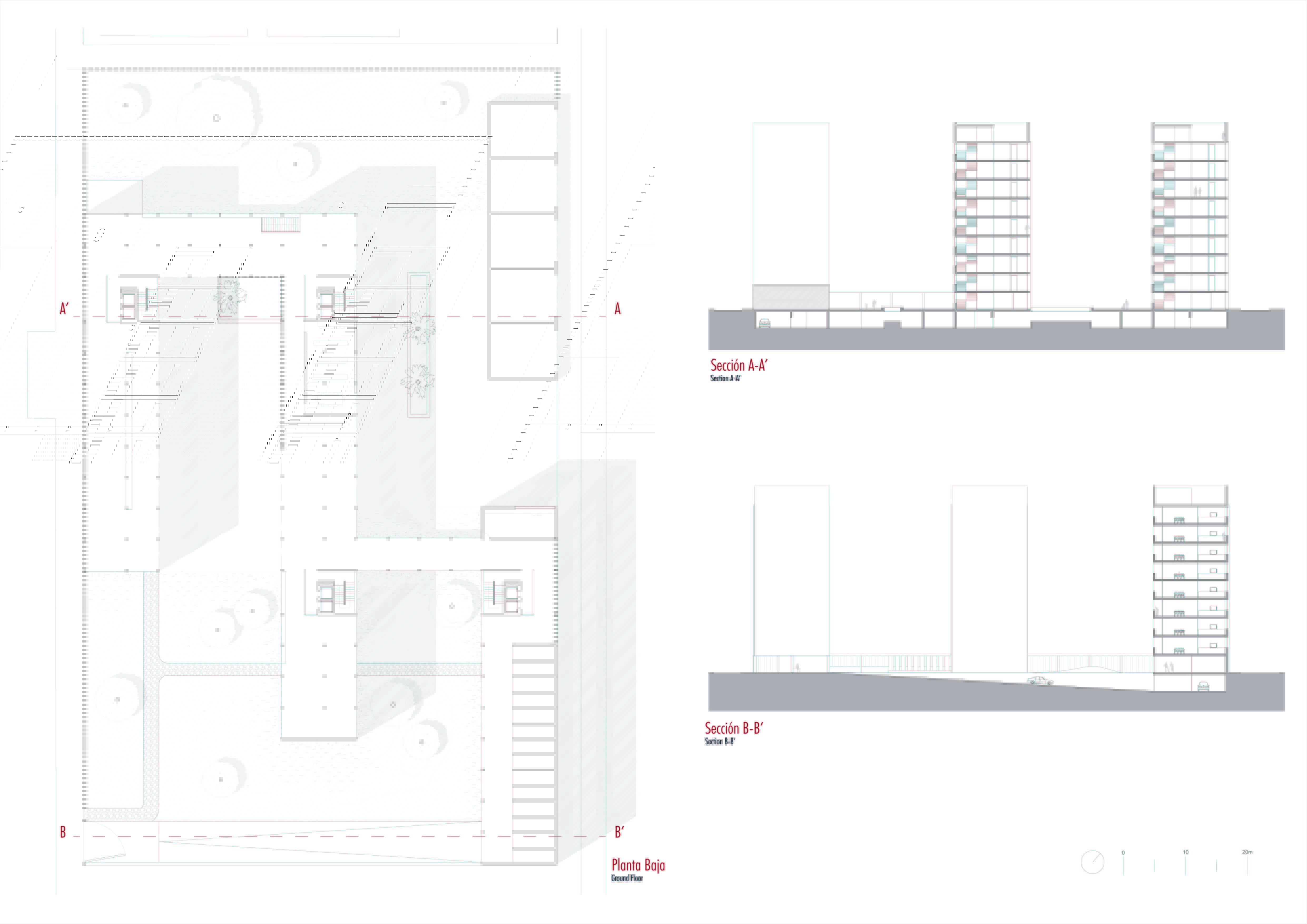 El proyecto se puede entender desde multiples recorridos: el del peatón y el del vehículo. Cada uno tiene su propio trazado, que confluyen en los espacios comunitarios de planta baja, rodeado de un vasto jardín de Jacarandas, Platanus Hispánica, y árboles de paraíso o Cinamomos, así como algún que otro arbusto y pequeñas colinas que surgen de la plana superficie de césped, dándole un aire más pintoresco.