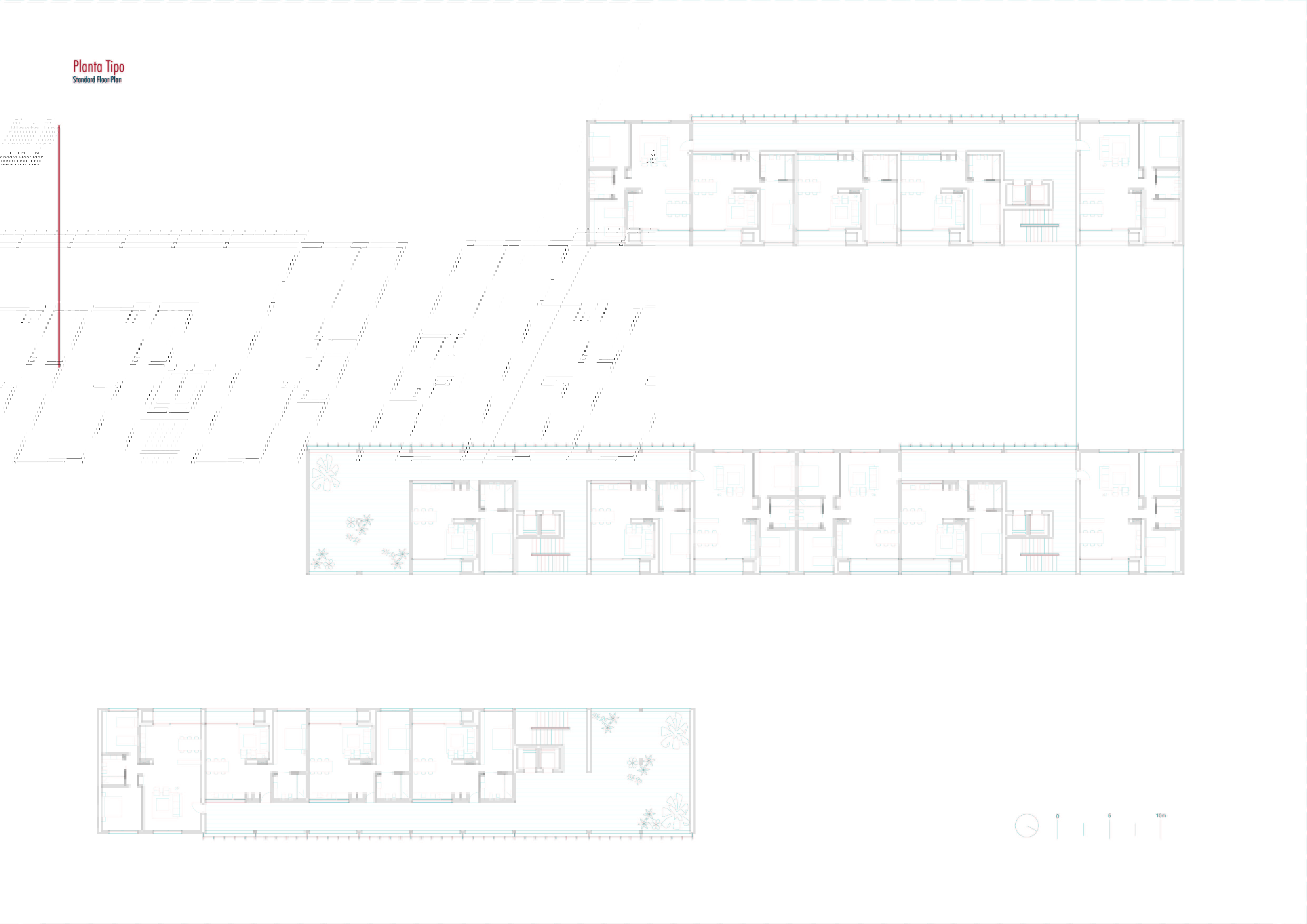 La propuesta para las 120 viviendas la parcela de Sevilla Este es un complejo de 3 volúmenes de 8 plantas que se alzan de entre una importante vegetación. El jardín es igual de importante o más que los bloques de viviendas, de hecho, como premisa inicial se parte de dividir el espacio en Edificado y Jardín, que tras múltiples planteamientos se termina por adoptar una postura en la que la vegetación rodea la arquitectura.