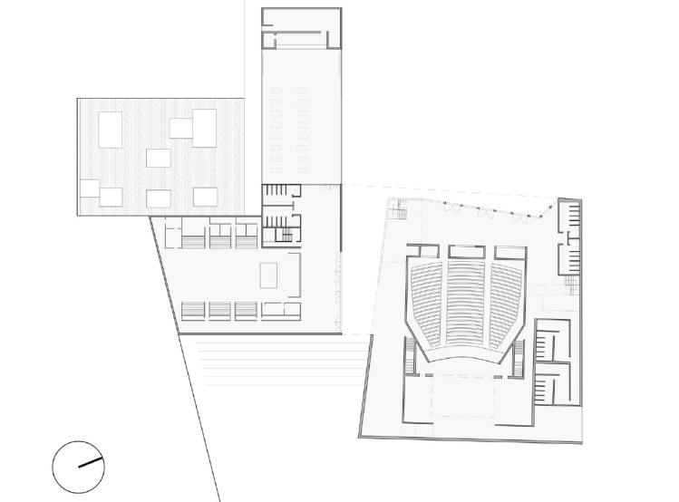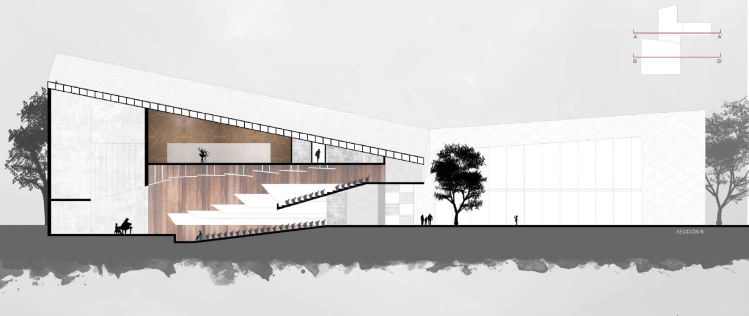 Este último volumen tiene adherida una plataforma de madera junto al restaurante con la intención de generar una terraza del bar o bien como otro espacio libre más dónde poder socializar antes, durante o después de algún evento que se realizase en el edificio.