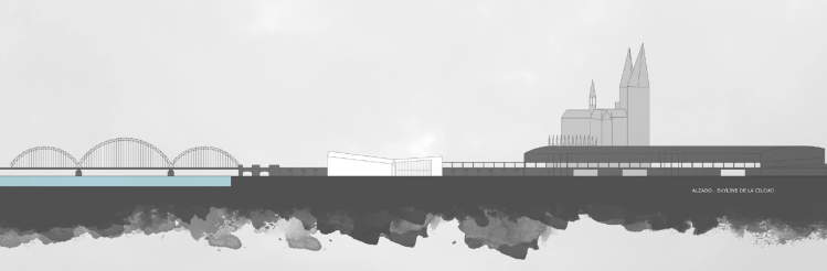 El auditorio a proyectar junto al río Rin (Colonia) y la estación de trenes, está situada en una parcela inmensa actualmente ocupada por una carpa de conciertos provisional. El primer reto al que nos enfrentamos fue gestionar esa imensa cantidad de metros cuadrados, así que decidimos proyectar un edificio y espacios al aire libre que se articularan entre sí para organizar y colonizar la zona de actuación.