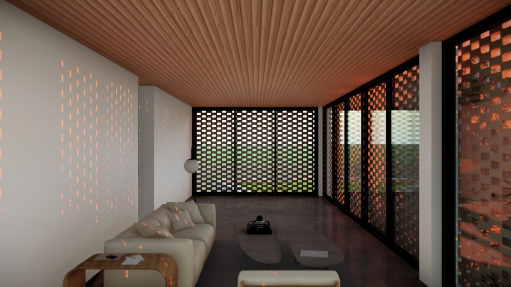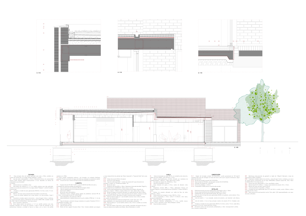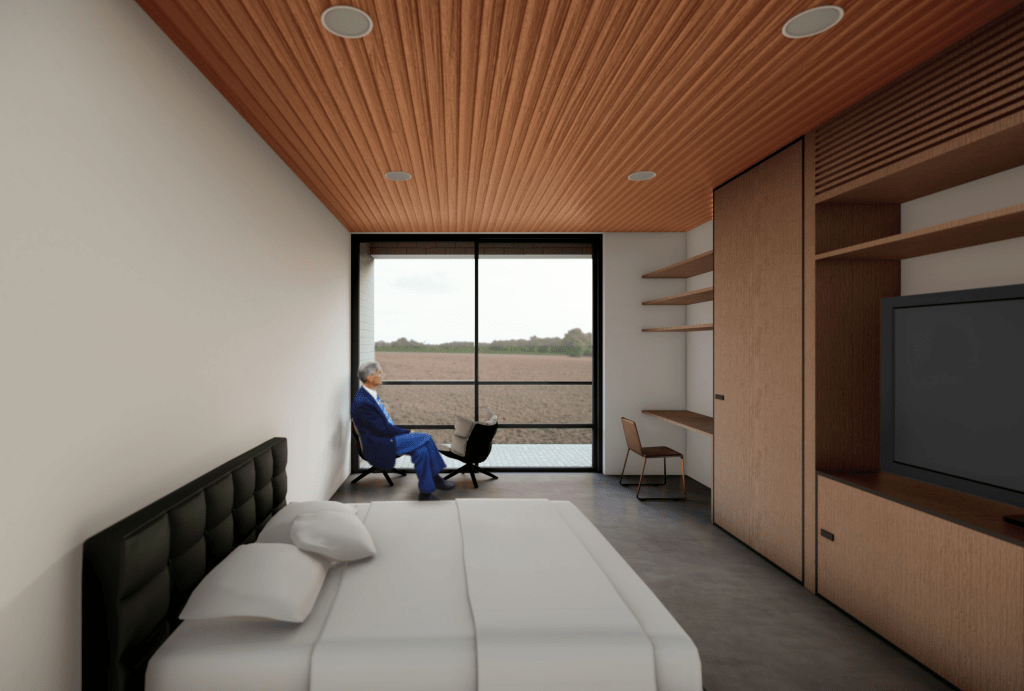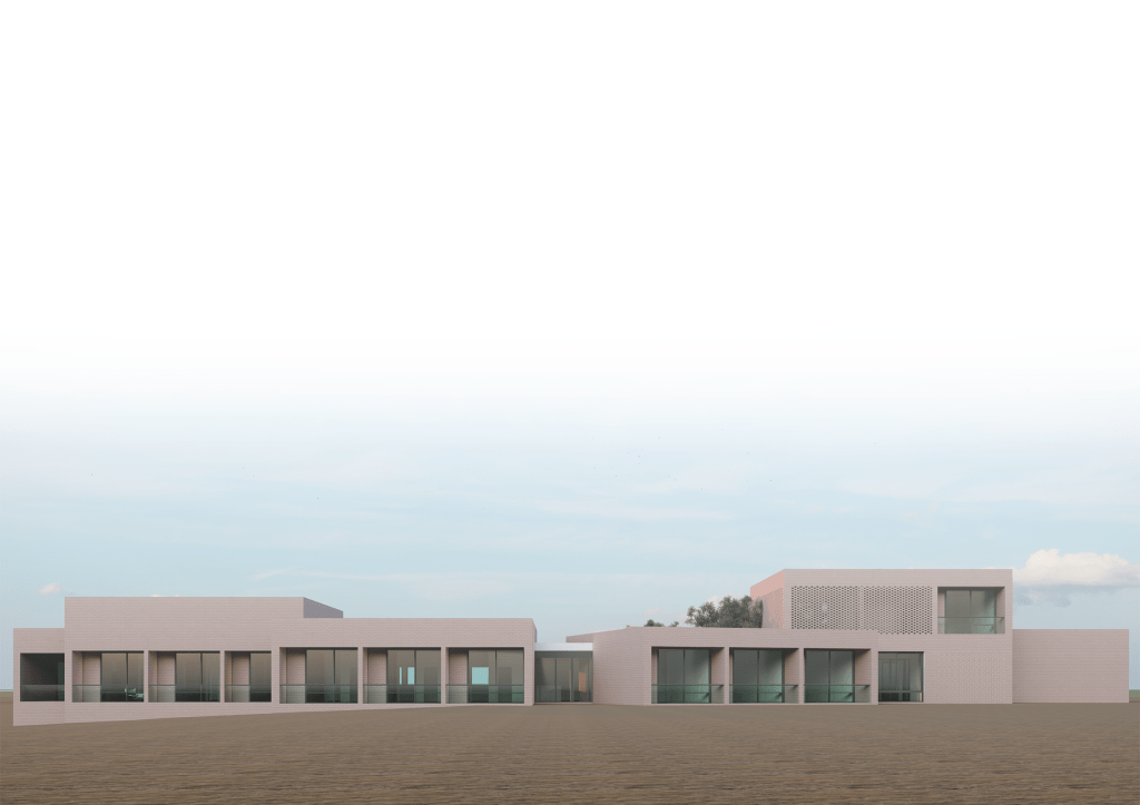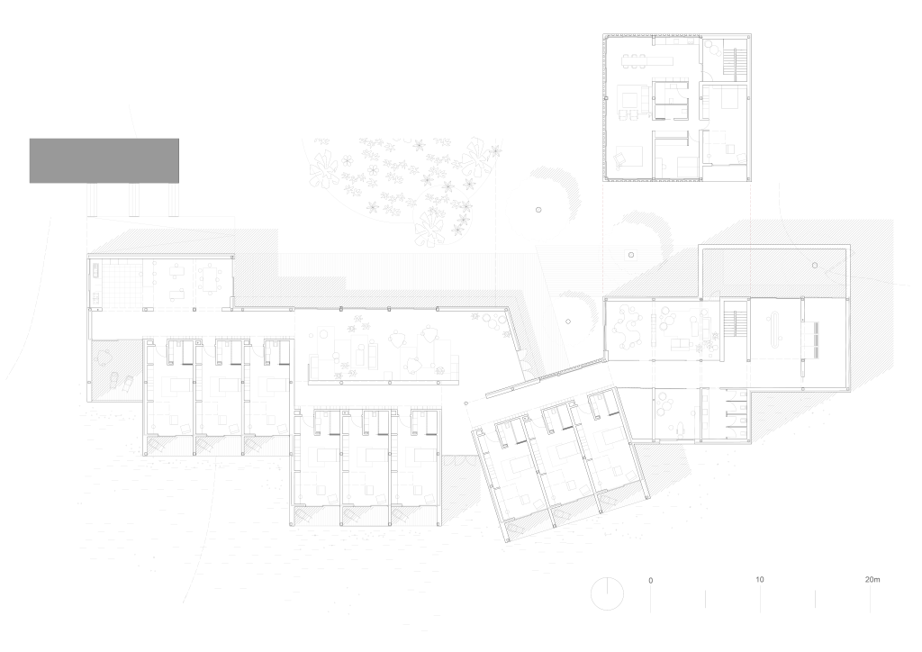 La edificación cuenta con las nueve habitaciones para los usuarios, un salón abierto al exterior, una cocina-comedor adaptada para las necesidades de este tipo de usuario, una sala de actividades y relajación compartimentable, una sala de curas, unos aseos, un espacio de lavandería, y una planta superior que alberga las habitaciones de los sanitarios y cuidadores, totalmente equipada con cocina propia y espacio de descanso, asi como también el proyecto alberga espacios dedicados a las instalaciones. El exterior es igual de importante en el proyecto, teniendo estos espacios exteriores vinculados al comedor y salón, una terraza al sur, y un patio interior. Además, cada habitación cuenta con una terraza exterior, para que los usuarios puedan disfrutar de vistas, la calidad del aire rural, y el sol.